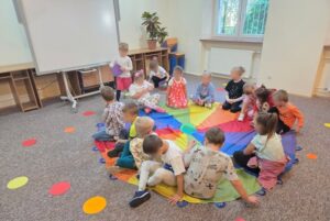 15 września 2025 r. w Bibliotece Pedagogicznej w Zgierzu odbyły się zajęcia “Dzień Kropki. Odkrywamy nasze talenty!”, inspirowane książką Petera H. Reynoldsa „Kropka”. W spotkaniu uczestniczyły 6-latki z Miejskiego Przedszkola nr 3 w Zgierzu. Zajęcia zaczęły się od zabaw z chustą animacyjną i… kropkami. Następnie dzieci wysłuchały historii o Vashti, która dzięki małej kropce odkryła, że potrafi tworzyć wspaniałe dzieła. To dało inspirację do rozmowy o talentach i umiejętnościach. Później każde dziecko stworzyło swoje Drzewo Talentów, przyklejając kropki – owoce symbolizujące różnorodne talenty. Powstała wspaniała, kolorowa galeria, pełna rozmaitych zdolności i pasji! W ostatniej części spotkania na dzieci czekała naukowa atrakcja – eksperyment, w którym powstawały kolorowe, tańczące kropki.